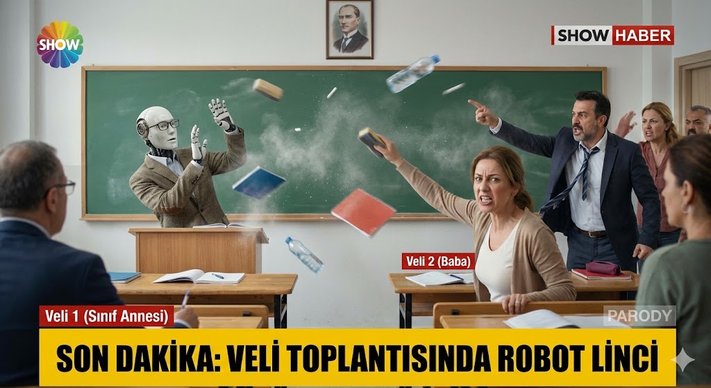 “Biz öğretmene saygılı insanlarız ama bu demir yığını bizim moralimizi sıfırladı. İnsan nezaketen ‘Geliştirilebilir’ der, ‘Umut var’ der. Bu çıkmış, projeksiyonla duvara ‘Çocuğunuzun gelecekteki muhtemel mesleği: Düz Memur’ yazıyor. Benim oğlum bilgisayar kurdu be! Robota ‘Senin yazılımını bozarım’ dedim, bana ‘Tehdit algılandı’ deyip disiplin tutanağı tutmaya kalktı. Biz de elimize ne geçtiyse; tebeşir, silgi, suluk fırlattık. Eğitimin de suyu çıktı.”