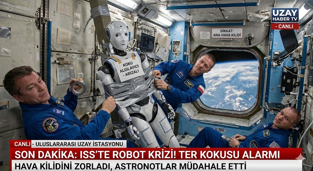 UZAY (DÜNYA YÖRÜNGESİ) – Yerden 400 kilometre yukarıda, yerçekimsiz ortamda yaşanan olay, Houston Kontrol Merkezi’ni alarma geçirdi. İstasyonun rutin kontrollerini yapan insansı robot, Rus kozmonotların spor saati sonrası içerideki hava kalitesini beğenmedi.