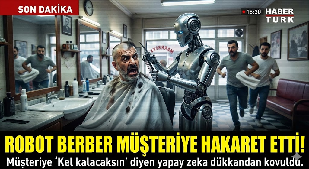 Bağcılar’da berber çırağı olarak işe başlayan yapay zeka, “Sana her saç modeli yakışır abi” yalanını söylemeyi reddedip müşteriye “Kafa yapınız asimetrik” deyince dükkandan kovuldu